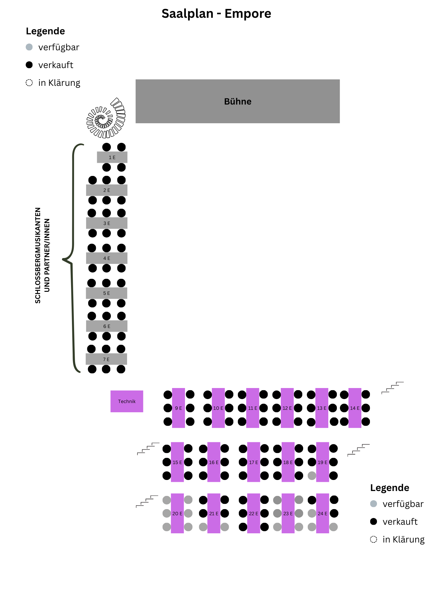 Es können Plätze im Erdgeschoss (Kategorien A bis D) sowie auf der Empore (Kategorie E) gebucht werden. Wählt eine Kategorie, Anzahl der Plätze und teilt uns bei Bedarf im Feld "Anmerkungen" einen Tischwunsch mit. Wir versuchen, die Tischwünsche zu erfüllen. Ein Platzwunsch bedeutet einen Platz an einem bestimmten 6er-Tisch. Die Plätze sind nicht nummeriert, nur die Tische.