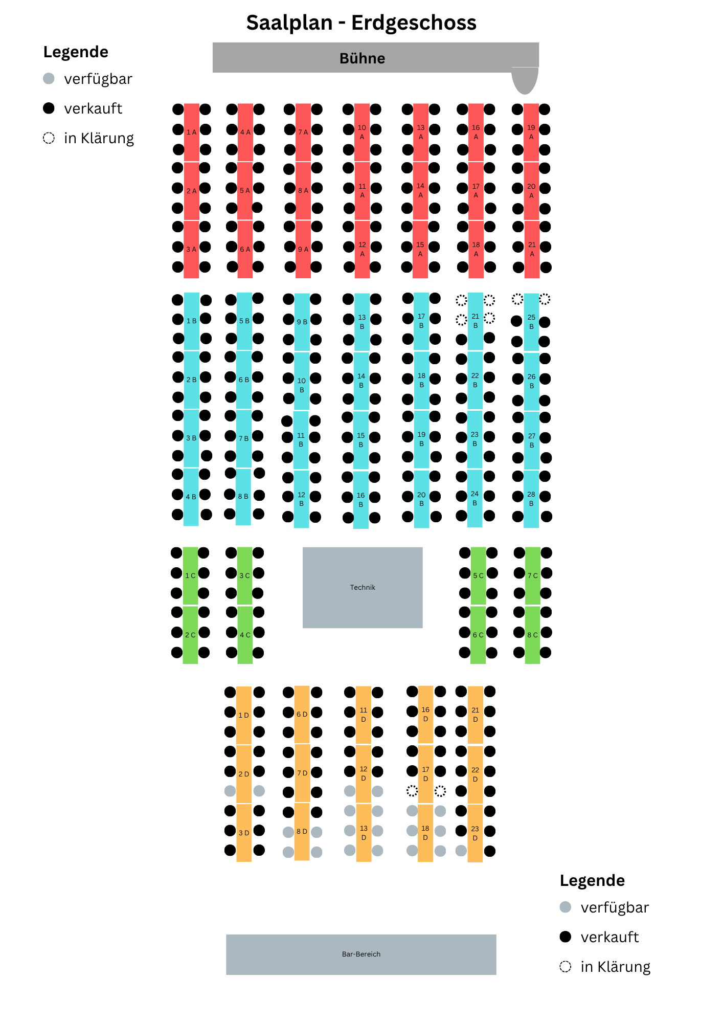 Legende: Graue Plätze sind noch verfügbar; schwarze Punkte sind die bereits verkauften Plätze, die weißen sind reserviert!